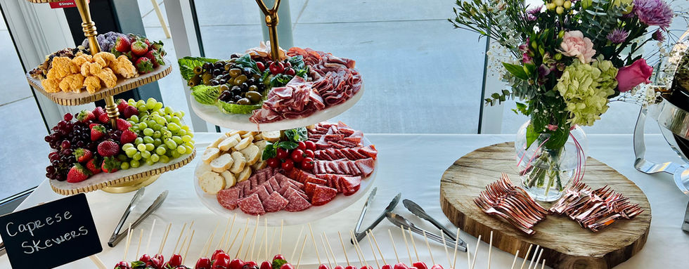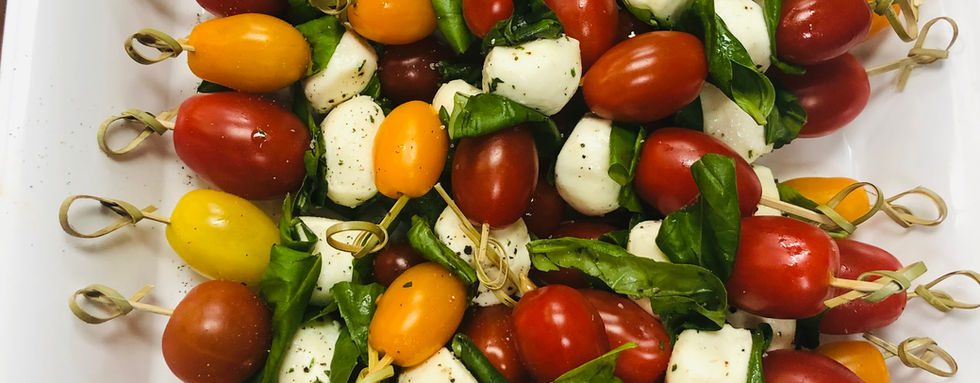 Marinated Mozzarella Pearls Skewered with Organic Cherry Tomatoes, and Basil. Drizzled with a Balsamic Glaze Reduction. 60 skewers per Platter.